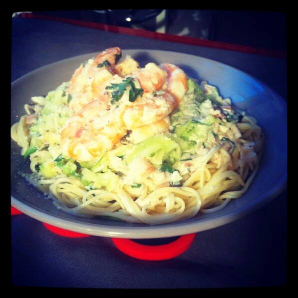7 – Dans les assiettes creuses, disposer d’abord les pâtes, puis les courgettes et enfin les crevettes avec leur sauce. Ajouter un peu de pamesan