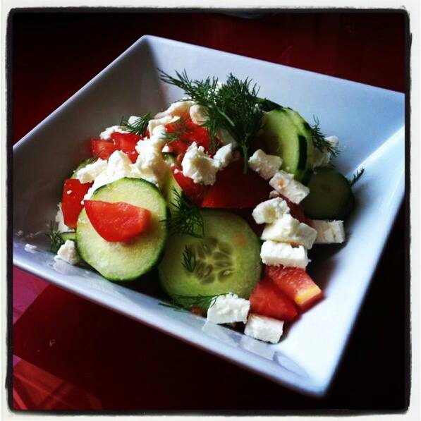4 – Disposer les concombres, les totames et la fêta dans les assiettes.