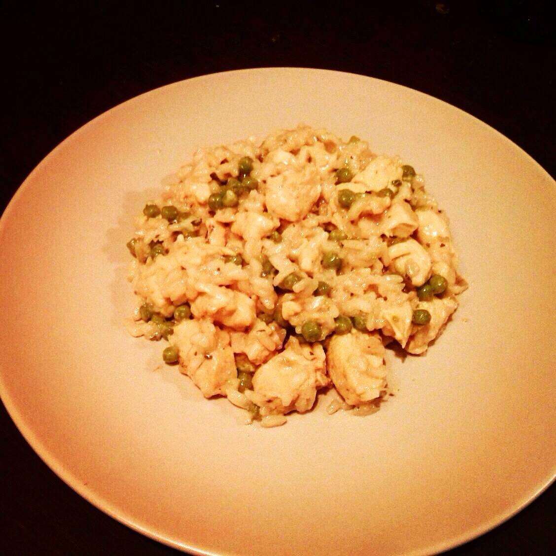 8 – Recommencer l’étape 7 jusqu’à absorption de la totalité du bouillon (surveiller la cuisson du riz en goûtant de temps en temps). Entre les louches, surveiller la cuisson des morceaux de poulets et des petits pois (environ 15 minutes de cuisson en théorie).