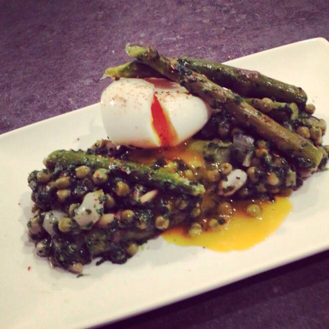 8 – Quand asperges, fèves, épinards, petits pois et œufs sont est cuit, assembler soit par couche, soit en mélangeant tous les légumes, et déposer l’œuf au sommet. Rectifier l’assaisonnement ci nécessaire